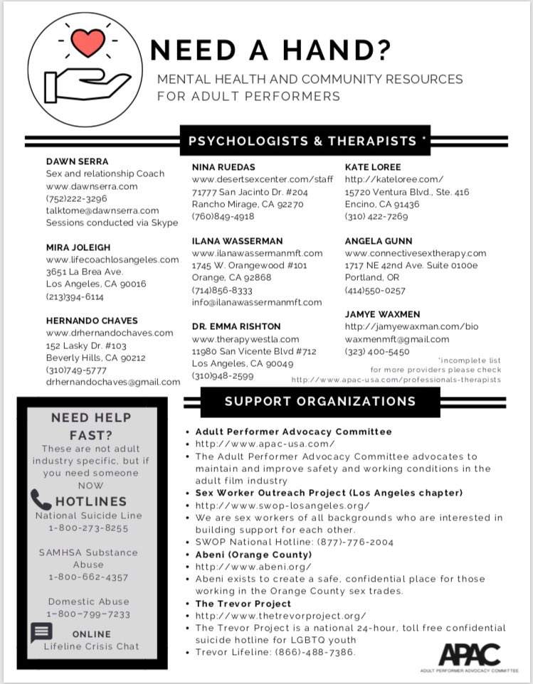 Adult Performer Advocacy Committee: The Adult Performer Advocacy Committee advocates to maintain and improve safety and working conditions in the adult film industry by giving adult performers education and organized representation in matters that affect our health, safety, and community.